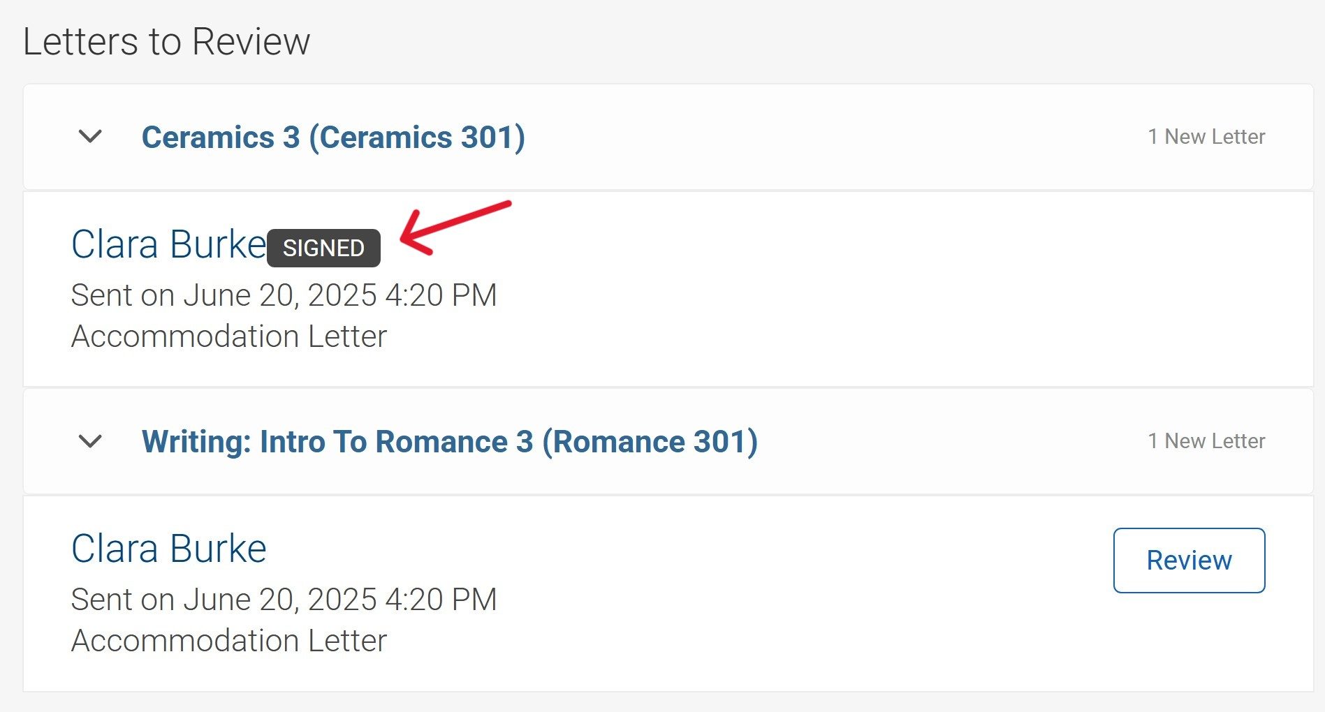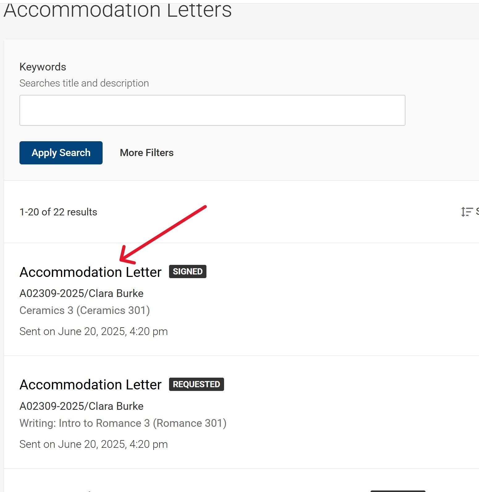 Letters that have already been acknowledged will not display under Letters to Review upon subsequent logins to the Accommodations Hub. To see all the letters sent to you: