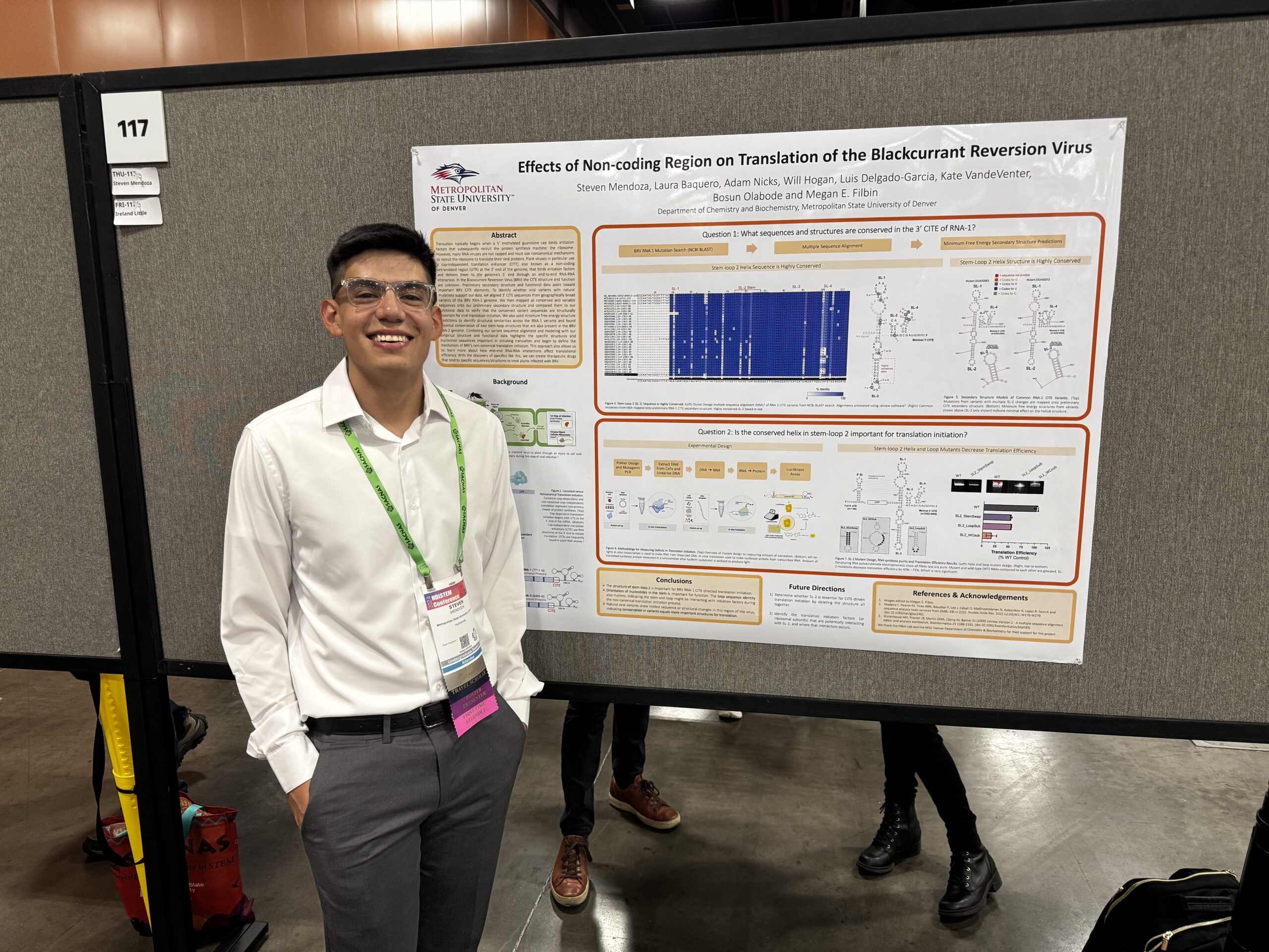 Steven Mendoza graduated in May 2025 with his B.S. in Biochemistry and will be attending the University of Houston this fall to begin his Ph.D. in biology/biochemistry. During his senior year, Steven was the President of MSU Denver’s SACNAS club and he oversaw its growth into a Provisional National SACNAS Student Chapter, and coordinated the group’s first university-wide panel discussion: Empowering Marginalized Students in 2025. He presented his research at the 2024 MSU Denver URCSP, American Chemical Society and NDiSTEM SACNAS conferences, as well as the 2025 ASBMB Discover BMB conference and RNA Society Meeting, at which he was awarded an undergraduate poster competition award! Steven’s community-focused leadership and can-do attitude perfectly capture the Roadrunner spirit. He is always willing to help his peers and soak up every experience with a smile. He will be sorely missed here at MSU Denver, but we are so proud of him and wish him the best in graduate school!