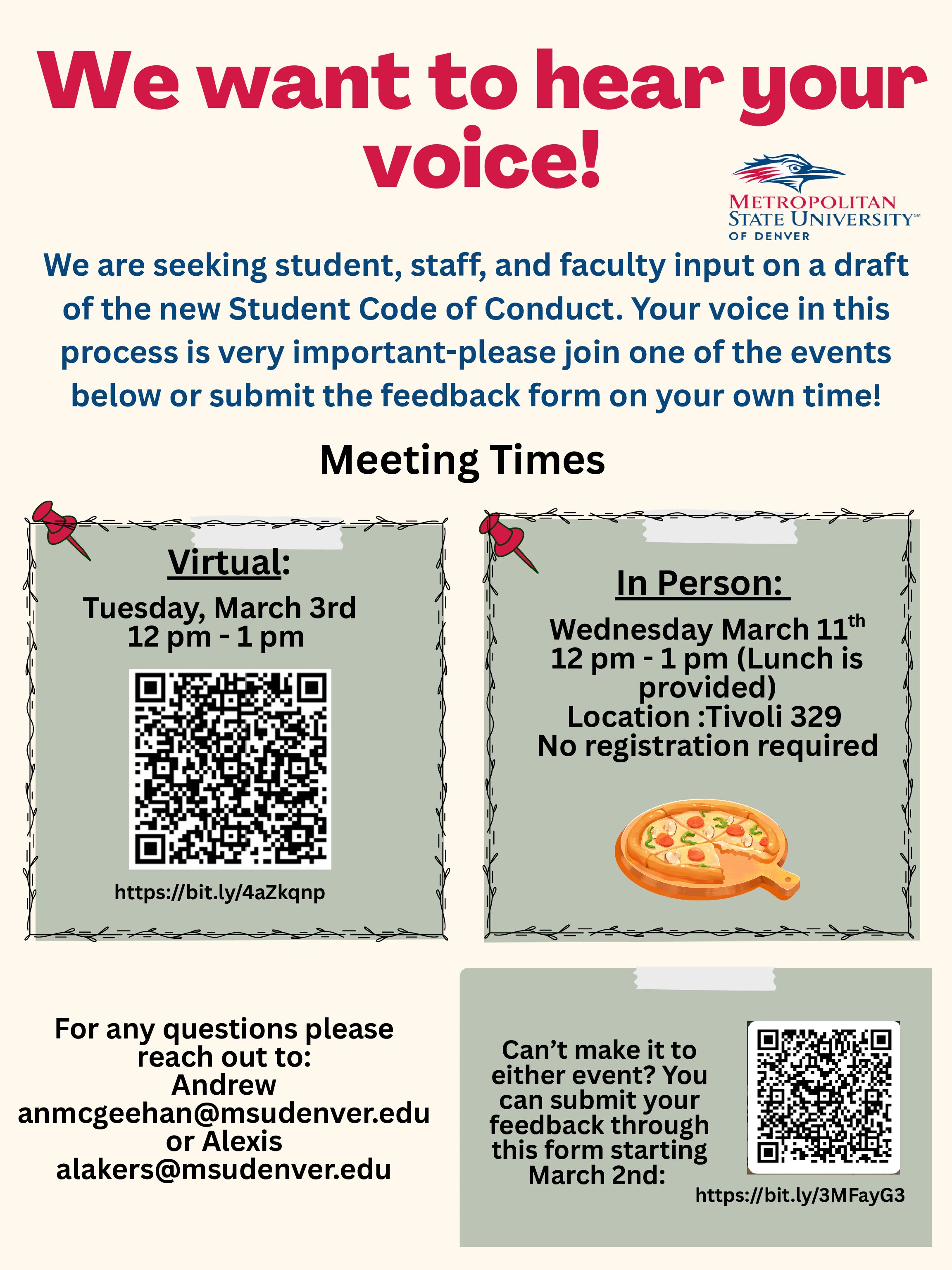 Contact UsThe Dean of Students Office has been leading a committee comprised of faculty, staff, and students for the past semester to undertake a review of the Student Code of Conduct. The committee has prepared a first draft that is open for comments and feedback from the entire MSU Denver Community. We will hold two events, one virtual on March 3rd and one in-person on March 11th where any MSU Denver community member can participate in providing feedback and comments. This site will also host a copy of the draft and a link to a form where feedback/comments can be submitted at any time. The public comment period will be from March 2nd through March 20th. Please reach out to Andrew McGeehan ([email protected]) or Alexis Lakers ([email protected]) with any questions!